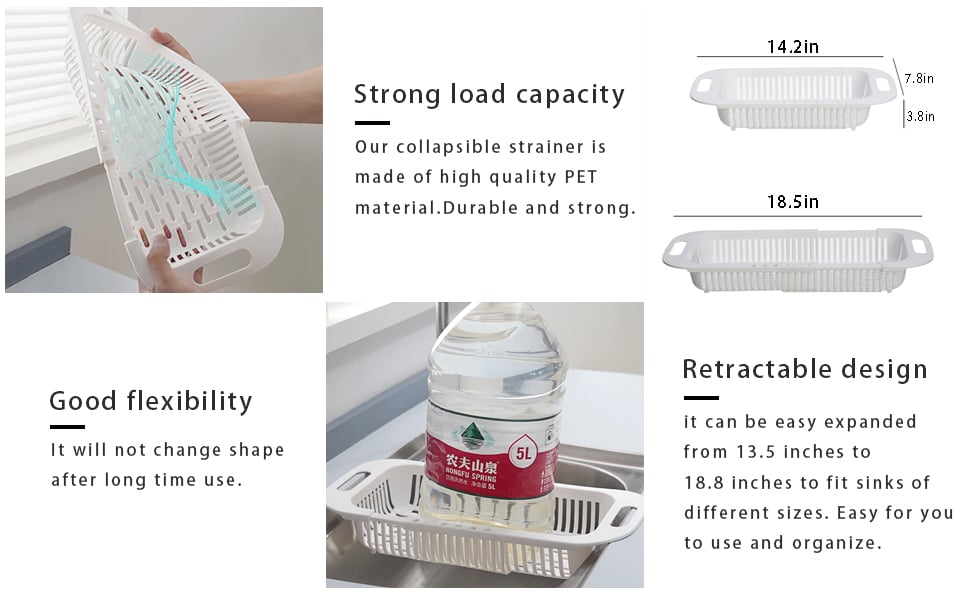 Modern Design - Adjustable, this colander expands from 14 to 18 inches to hold more or less, save space when not in use and fit most sinks. When stretched over the sink, the bottom is raised from your sink base, preventing drained pasta water from backing up into your food.